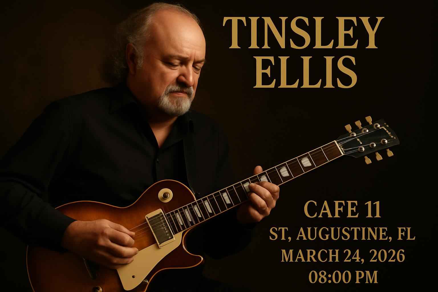 The Tinsley Ellis concert at Cafe 11 in St. Augustine begins at 8:00 PM on March 24 2026. Arrive early to secure preferred seating and enjoy pre-show amenities.