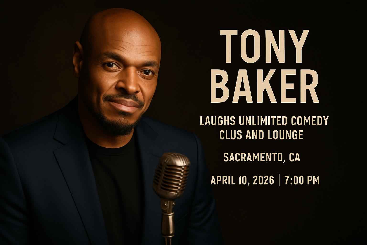 Experience nonstop laughter with Tony Baker at Laughs Unlimited Comedy Club and Lounge in Sacramento CA on April 10 2026 at 0700 PM. Secure your tickets to see Tony Baker live in Sacramento and enjoy exclusive promo codes from RSVP Event Agency for this highly anticipated comedy night. This event delivers top-tier stand-up comedy in the heart of Old Sacramento drawing fans seeking unforgettable entertainment and the best ticket deals available online.