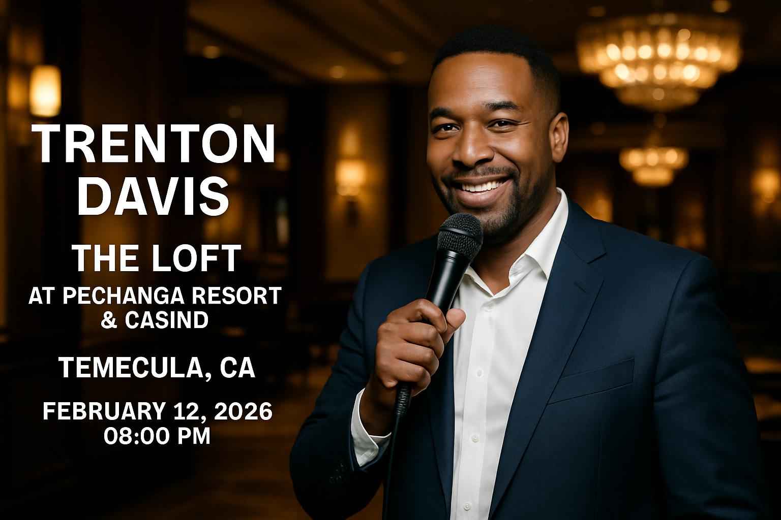 Trenton Davis brings his acclaimed comedy to The Loft At Pechanga Resort & Casino in Temecula CA for a one-night-only performance. The show starts at 8 PM on February 12 2026. The Loft offers an intimate venue combining top-tier sound and hospitality for a premium entertainment experience. Attendees frequently search for Trenton Davis tickets Temecula and Pechanga comedy show specials for this event.