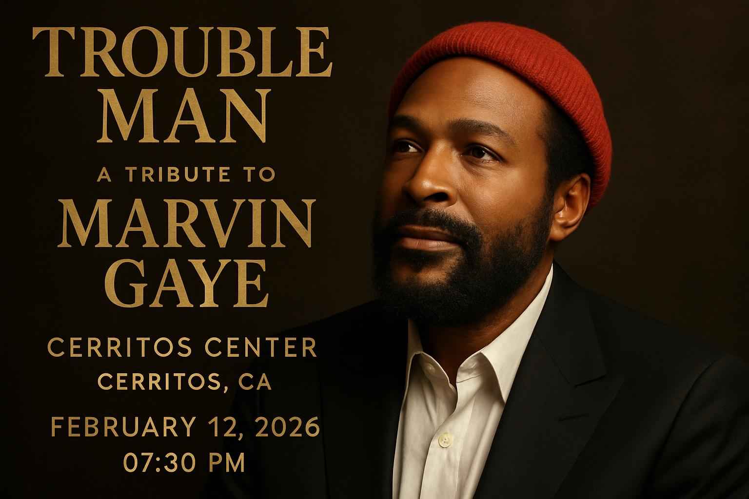Experience the soulful sounds of Trouble Man – A Tribute to Marvin Gaye at the Cerritos Center in Cerritos CA on February 12 2026 at 0730 PM. Discover exclusive coupon codes for this highly anticipated concert and secure your discounted tickets with RSVP Event Agency. Immerse yourself in Marvin Gaye classics performed live in one of Southern California’s premier event venues.