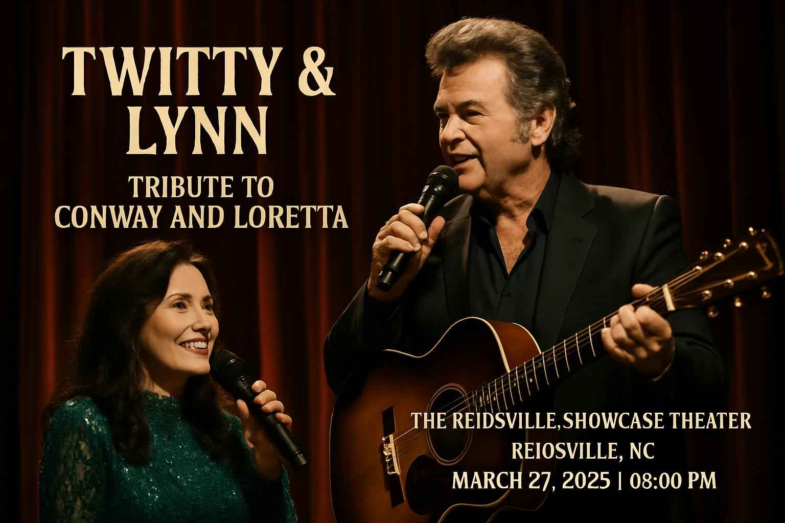 Twitty & Lynn – Tribute to Conway And Loretta delivers a true-to-life performance featuring popular duets and solo hits. Hosted at The Reidsville Showcase Theater in the heart of Reidsville NC this concert draws country music fans from Greensboro Danville Burlington and surrounding areas. Doors open at 7:00 PM with the show starting promptly at 8:00 PM on March 27 2026.
