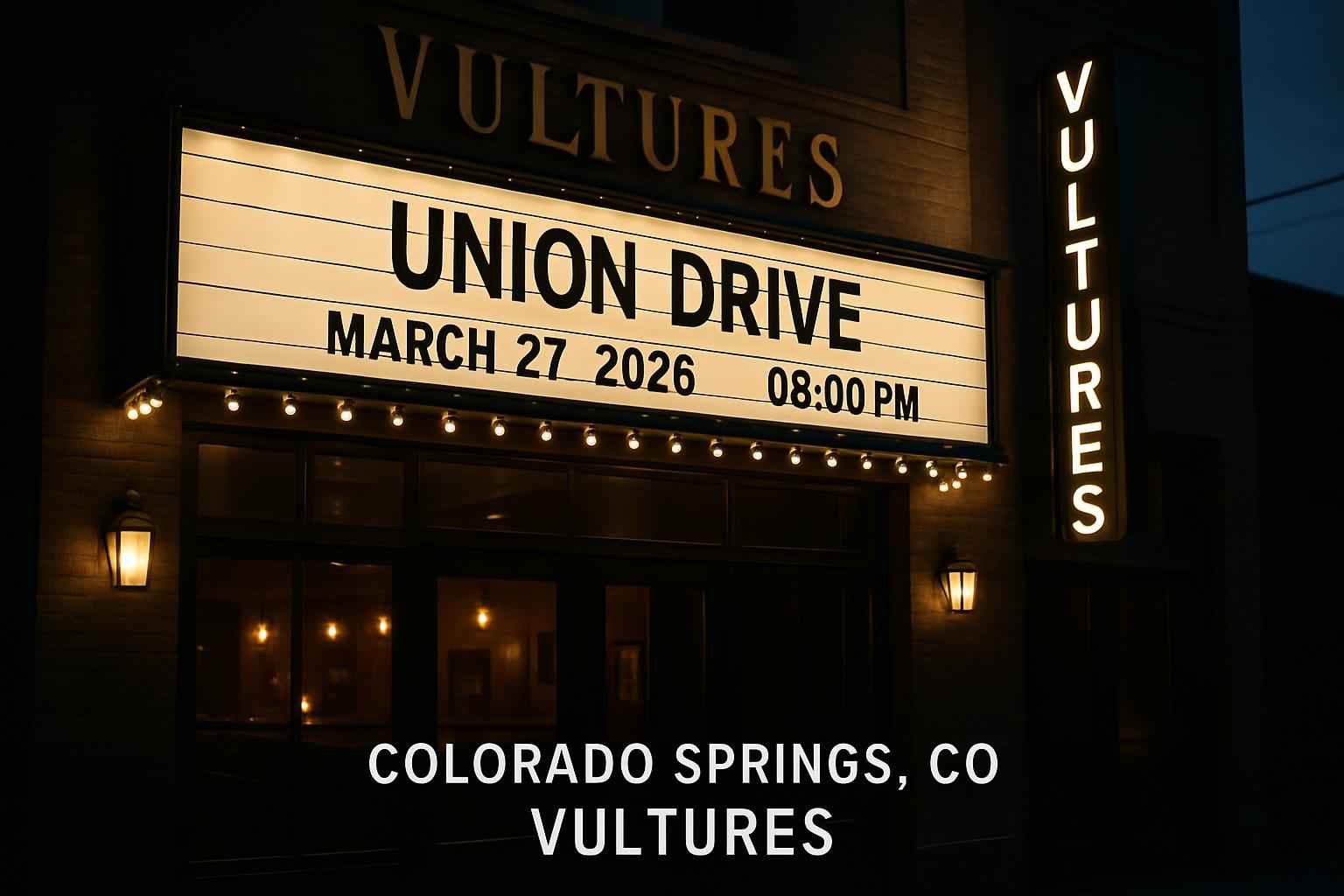Union Drive – Vultures will perform live at a top-rated Colorado Springs venue on March 27 2026 at 8:00 PM. The event features a dynamic setlist and immersive atmosphere for fans from across El Paso County and beyond. Plan ahead for parking public transportation and local dining options to make the most of your concert night in Colorado Springs. Reserve your tickets early for the best seating and access.