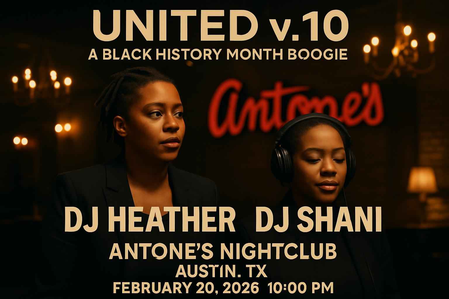 Celebrate Black History Month at UNITED v.10 Boogie on February 20, 2026, 10 PM, at Antone's Nightclub, Austin. Featuring house legends DJ Heather and DJ Shani, enjoy vibrant music and community vibes. Secure discounted tickets and VIP upgrades with exclusive RSVP Event Agency promo codes. Experience a memorable night honoring Black history and house music culture.