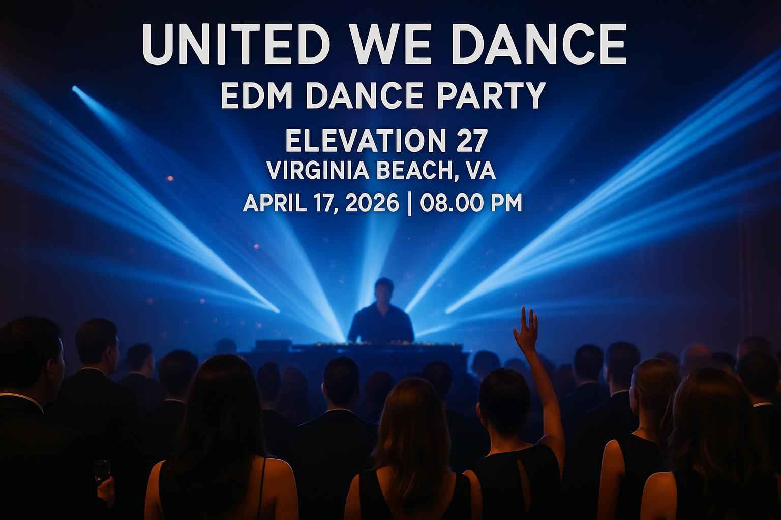 United We Dance – EDM Dance Party takes place on April 17 2026 with doors opening at 7 PM and music starting at 8 PM at Elevation 27 Virginia Beach.