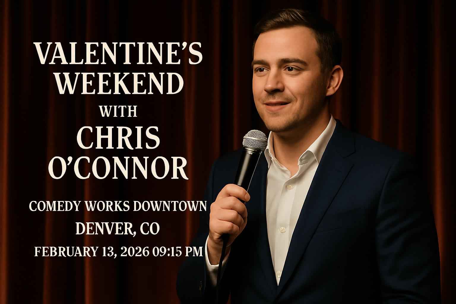 Experience Valentine’s Weekend With Chris OConnor at Comedy Works Downtown in Denver CO on February 13 2026 at 0915 PM. This live comedy event brings top-tier entertainment to the heart of Denver making it a must-see for couples and comedy fans. Secure your tickets early to guarantee your spot for one of the most anticipated Valentine’s Day events in Denver. RSVP Event Agency provides exclusive promo codes for this event saving you money while delivering a memorable night out.