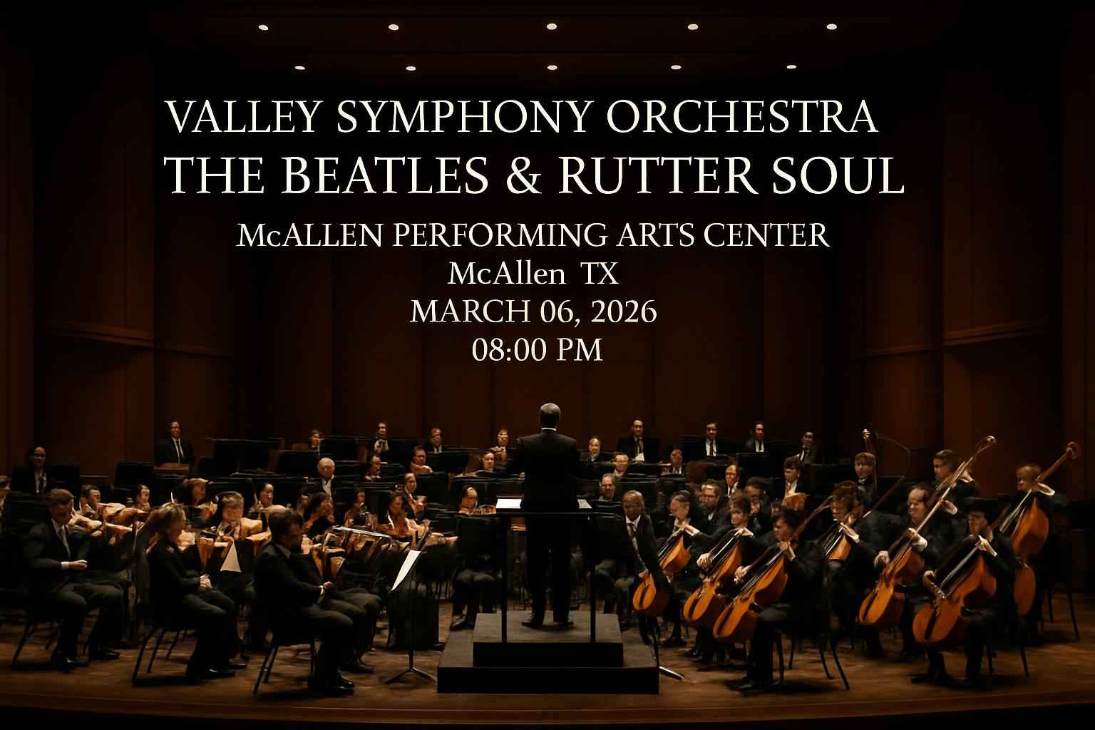 TLDR: On March 6, 2026, the Valley Symphony Orchestra performs a unique concert blending The Beatles' classics with John Rutter's arrangements at McAllen Performing Arts Center. RSVP Event Agency offers exclusive coupon codes and discounts for tickets, including VIP and group options. The venue provides ample parking and accessibility, ensuring a memorable live music experience in McAllen, TX.