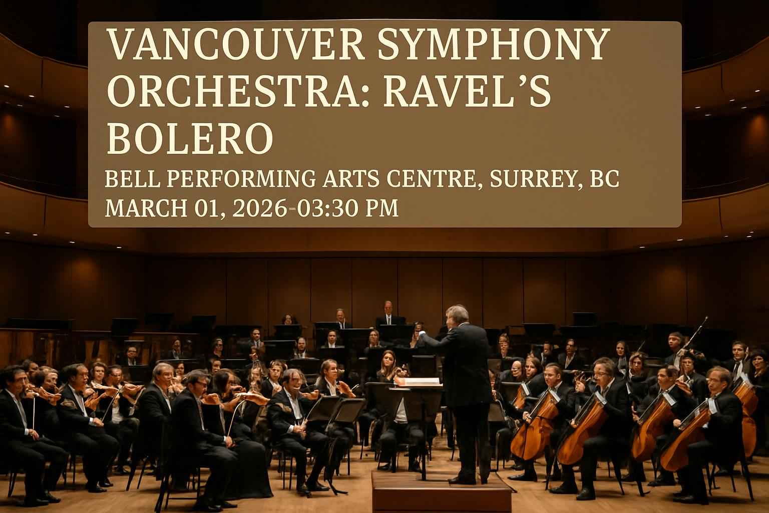 Experience the Vancouver Symphony Orchestra performing Ravels Bolero at the Bell Performing Arts Centre in Surrey BC on March 01 2026 at 0330 PM. Secure verified tickets at the best price with exclusive RSVP Event Agency coupon codes. This live symphony performance is a top-rated event for music lovers searching for Ravel’s Bolero tickets or discounted admission in Surrey. Access unbeatable deals and enjoy one of the most celebrated orchestral works in a renowned local venue.