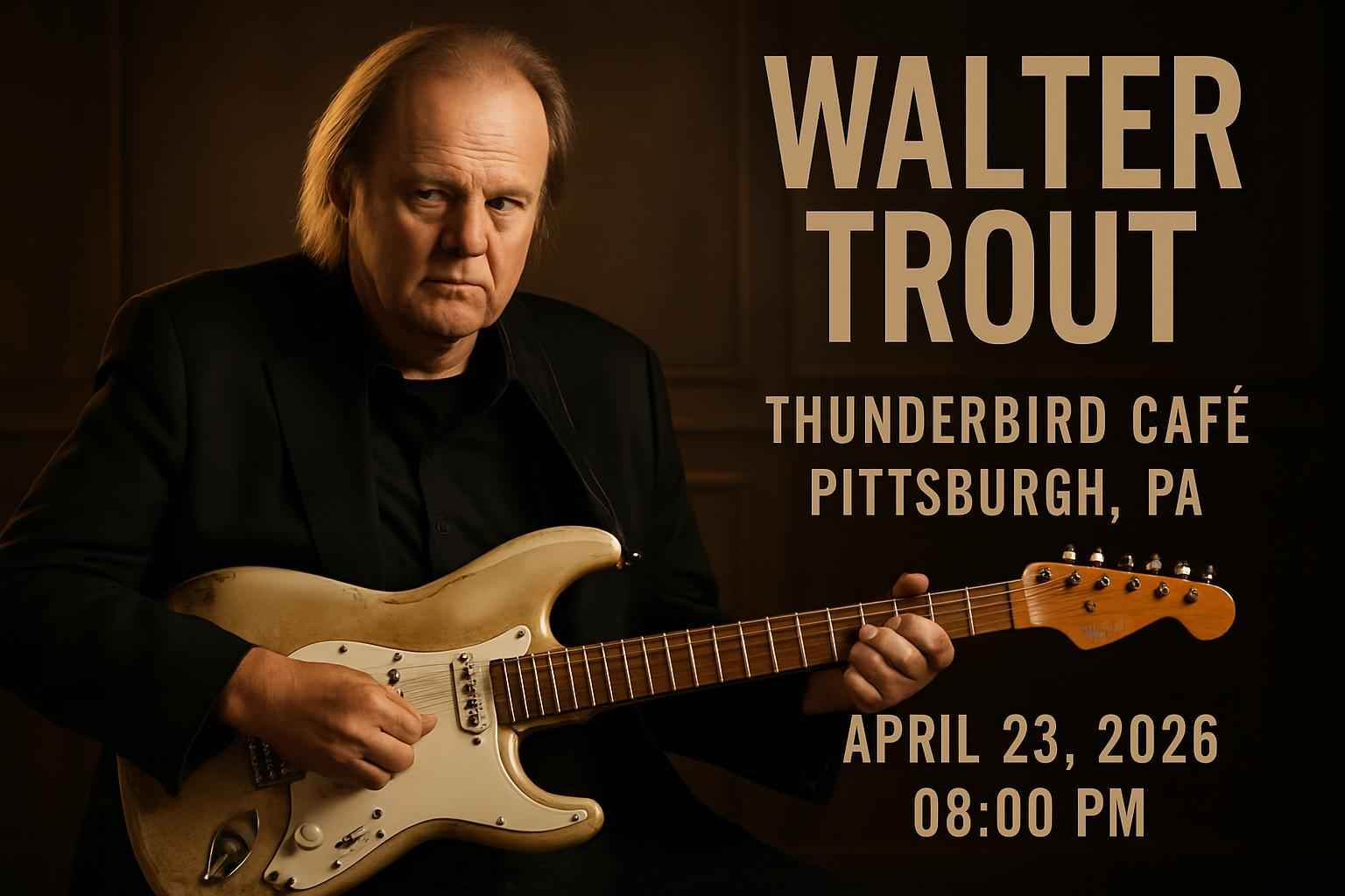 Walter Trout is scheduled to perform at 8 PM on April 23 2026 at Thunderbird Cafe in Pittsburgh PA.