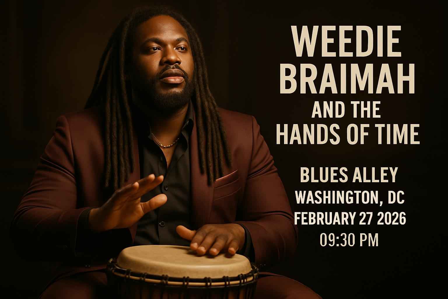 Weedie Braimah and The Hands of Time will perform at the iconic Blues Alley located in the heart of Georgetown Washington DC. This unique live event starts at 0930 PM on February 27 2026. Expect an evening filled with high-energy rhythms and masterful drumming from Weedie Braimah accompanied by his world-class ensemble. Blues Alley is known for its intimate setting and premier jazz events making it a top venue for DC music fans.