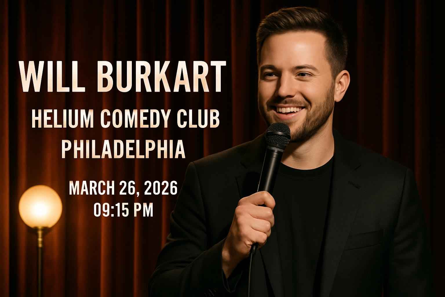 Will Burkart will perform live at Helium Comedy Club located at 2031 Sansom St Philadelphia PA 19103. The show begins at 0915 PM on March 26 2026. Doors open one hour before the event giving you time to enjoy food drinks and the lively club atmosphere. Arrive early for the best seating at this popular Philadelphia comedy event.